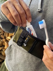 歯ブラシや歯磨き粉、小さな洗顔フォームなどのアメニティグッズの収納、持ち運びに最適なポーチ。
