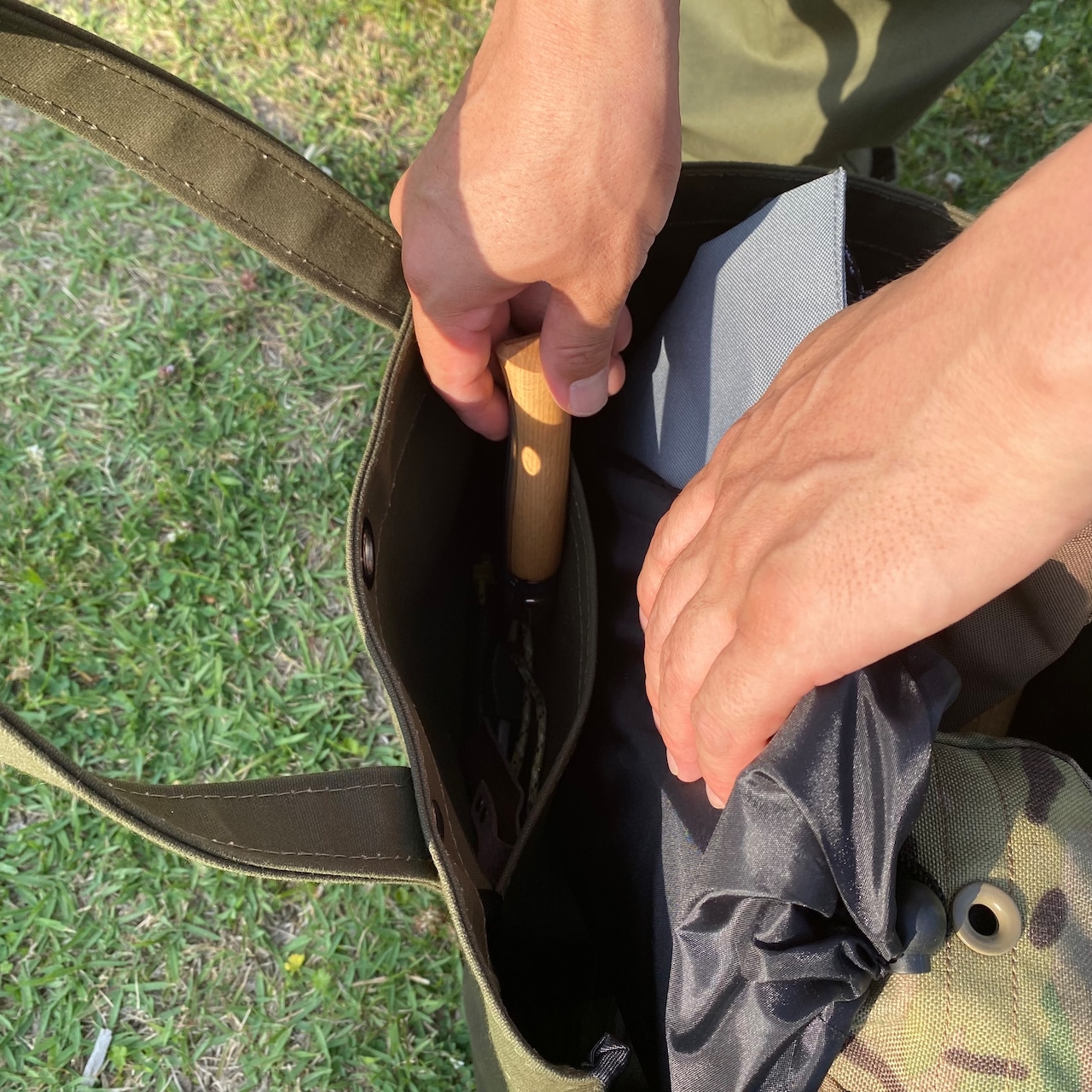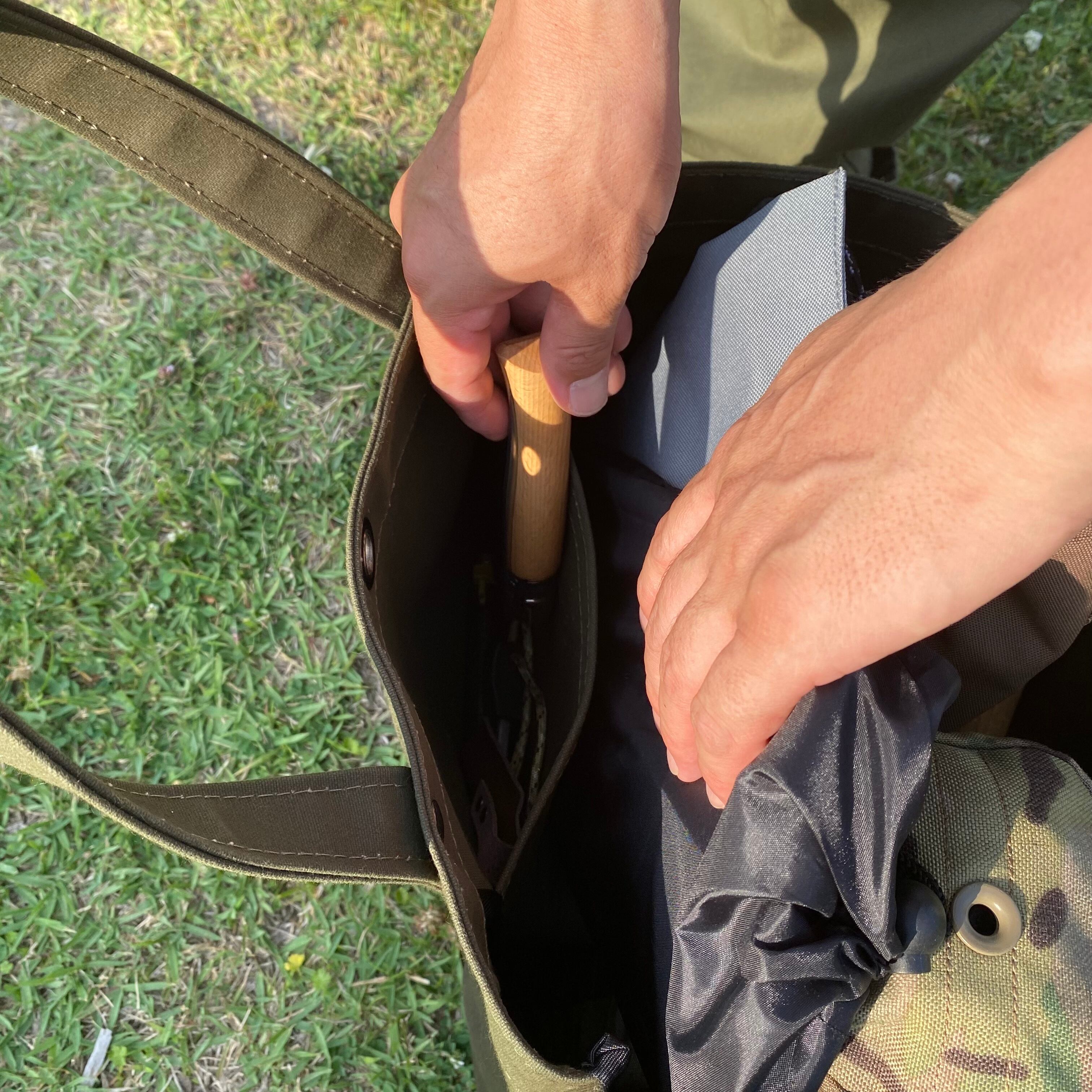 こちらの商品には自衛隊のテントにも使われている強力なパラフィン加工を施した9号タイガー帆布を使用しています。